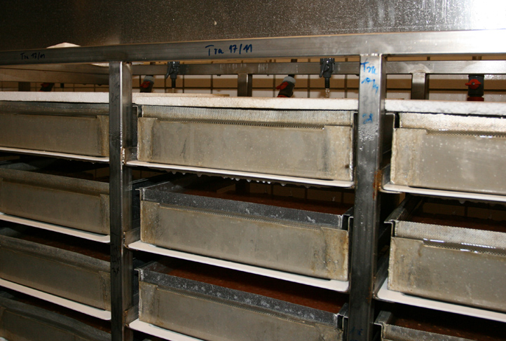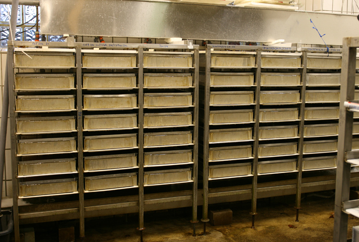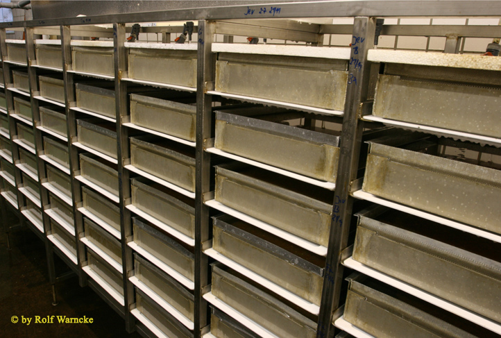 Die gefüllten Kästen im Brutschrank aufgereiht. Deren Gesamtinhalt beinhaltet eine Million zukünftiger Meerforellen - wenn alle durchkommen würden. Leider erreichen aber nur ca. 15-20 % das Parr-Stadium und nur 3 bis 5% der Brütlinge sollten als geschlechtsreife Fische in ihre Heimatflüsse zurückkehren. Davon sind wir aber in der Trave noch weit entfernt, obwohl die Fische qualitativ und quantitativ gut abwachsen.