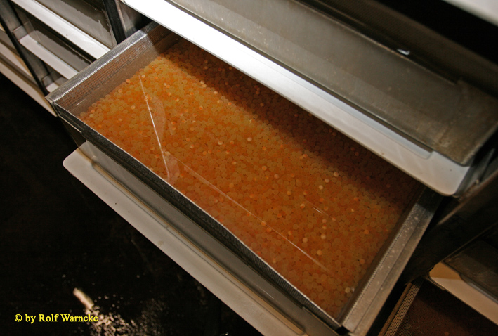 Die blinden Eier sind abgestorben und werden nach der Ruhephase, in denen die Eier nicht bewegt werden dürfen, entfernt. 5-10 % des Rogens entwickelt sich nicht.